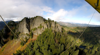 Unfortunately, when we were set to launch an hour later, the winds lightened up, although still soarable along the ridge above Highway 14 with narrow lift band; we just couldn't get too high for the first flight. The highest I got was on the 3rd flight which was about 300ft above (almost 900ft AGL) around 5:30pm. On my second flight, I tried to top land at a cross wind on the uphill slope, however my approach was terrible, which ended with me slamming into the ground instead of landing (or you can say crash landing or BIG WHACK).I unhooked and checked to see if everything was okay after the crash, as well as checking to see if I broke any bones. Fortunately, everything turned out okay so I re-launched again shorty. At this time, the lift band had expanded and thermals were starting to get better which made the soaring much easier than earlier. I got higher and higher, but also felt the throbbing of my left shin from the BIG whack earlier. So even though conditions had improved, I've decided to best head out and land. I made it to the LZ by the river with plenty of attitude and had a soft landing on an uninjured right foot. My Gopro was off on my second flight so I didn't captured the crash landing, but Ray saw it so maybe he can fill in with more details. By the time we finished packing, it was getting close to sunset and Ray still skyed out with a couple of paragliders. He landed right before sunset. We had dinner at Hood River "Crazy Pepper" with Mark , Enrique and our driver Justin. I will post the video later.