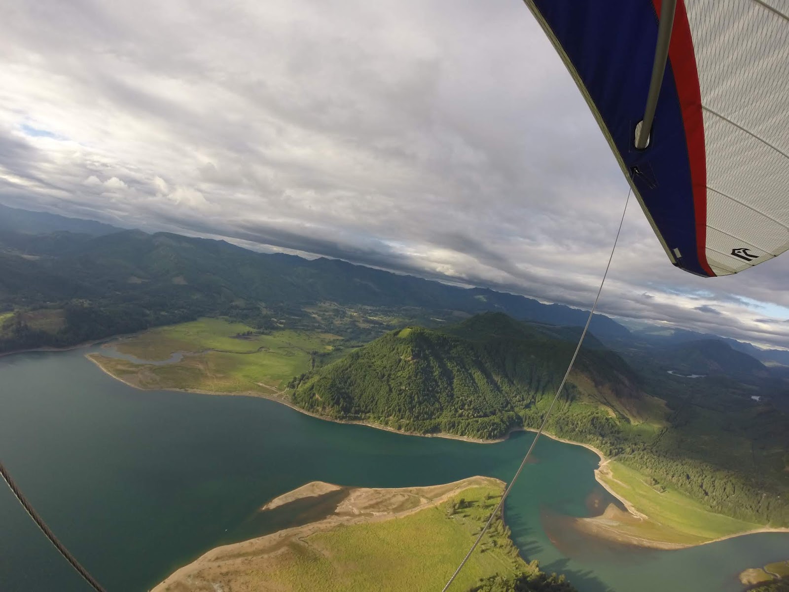 It was blowing strong west when l arrived Dog LZ at 11:45PM. The sky was overcast with high cloud ceiling as shown in the photos. I launched after Alan and Kt.at 1:15 pm; they both had great soaring flights climbing a few hundred feet above launch. Kt landed at the north direction with good approach and landing. Four PGs showed up before I launched, but didn't fly due to the wind conditions being too strong and gusty (approx 15-20 West and switchy to NW and North sometime). I was able to soar to the north ridge, got up to 800ft above launch and flew to Elk across the lake shortly. Lifts were pretty consistent over Elk. My maximum altitude was about 3,300ft MSL. (1,100ft above launch). I cruised around between Elk and North ridge a couple of times before coming to land two hrs later in light north wind direction. The sky was looking gloomy and rain was heading in around 5:00pm from Morton, so everyone passed on doing a late evening flight. Light rain finally arrived around 6:00pm. So for today, only 3 hangs flew.